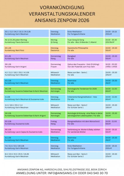 Vorankündigung Veranstaltungskalender anisanis zenpow 2025 & 2026